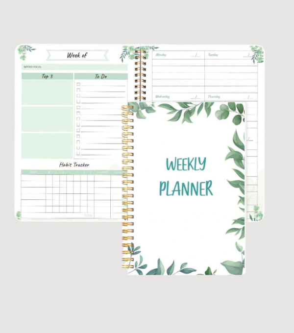 Our Weekly Planner Notebook, a perfect companion for organizing your busy schedule. This A5 planner features a sleek design with twin-wire binding, hard cover and 100gsm thick paper. This planner is undated providing you with all the essentials to stay productive and motivated throughout the week. With its spacious layout, you can easily jot down your appointments, to-do lists, important tasks, goals and habit tracker. Stay on top of your tasks with our stylish and functional Weekly Planner Notebook.